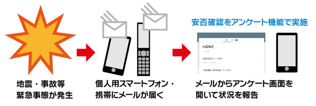 アンケート機能を使い、自然災害や有事の際に会社社員の安否確認を取ることも出来ます。アンケートの結果は管理者がPCやスマホでリアルタイムに確認できるため、迅速な対応が取れます。また、学校関係の連絡ツールとしても有効なツールです。